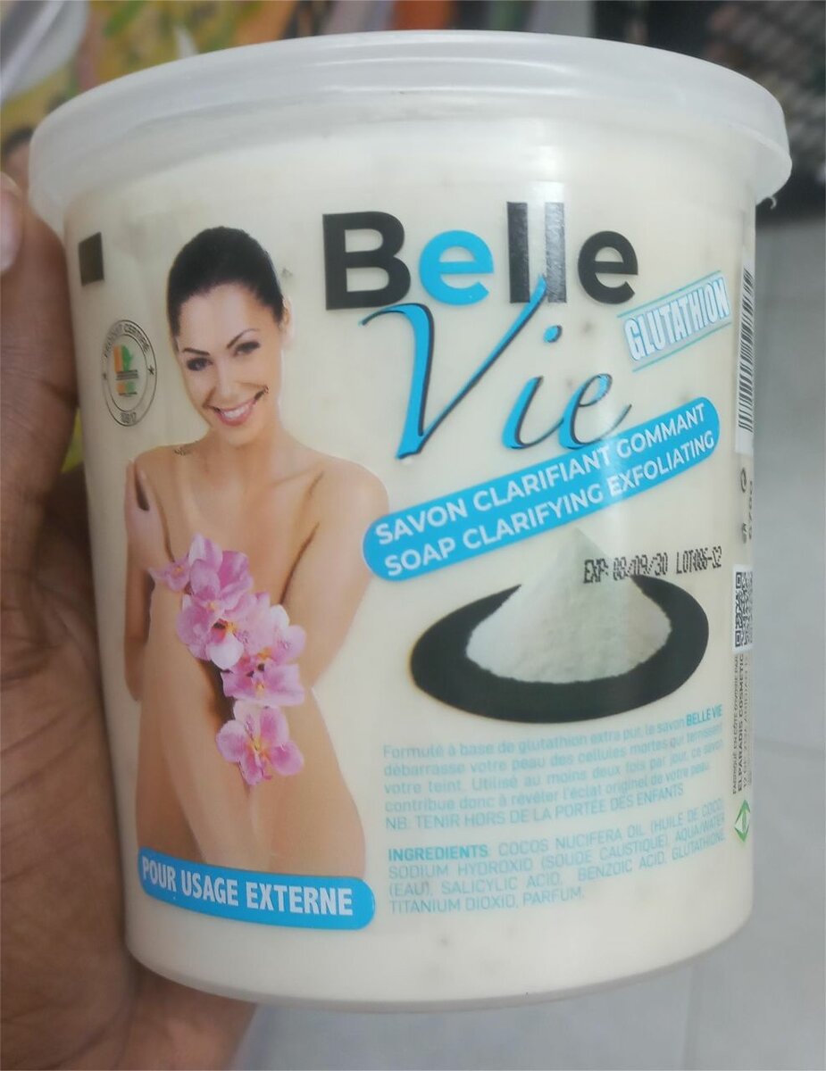 Savon clarifiant et exfoliant Belle Vie enrichi au glutathion, tomate et citron. Idéal pour une peau éclatante et douce. Utilisation quotidienne recommandée pour un soin complet.
