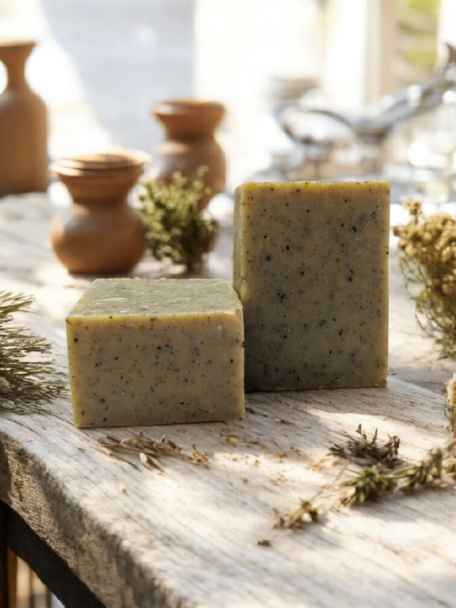 Savon du visage à base de clou de girofle, arbre à thé et curcuma, idéal pour la peau grasse acnéique.