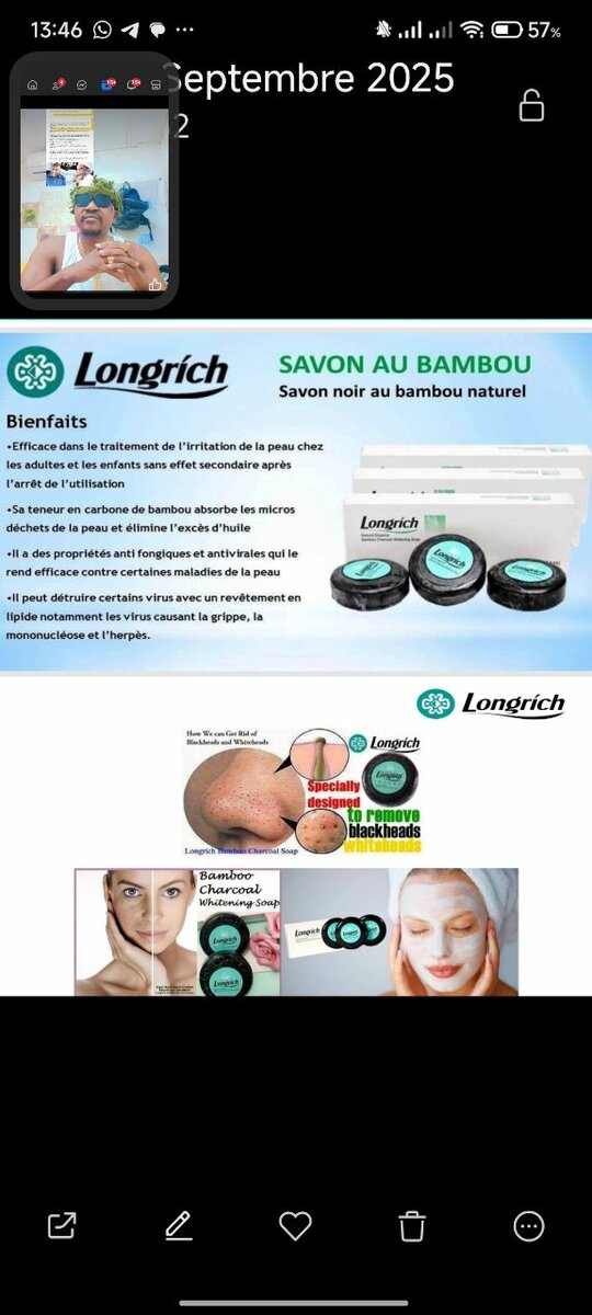 Découvrez le savon noir au charbon de bambou Longrich. Nettoyant et exfoliant, il combat l'acné, les points noirs et l'excès de sébum. Idéal pour une peau éclatante et saine. Utilisez-le quotidiennement pour réduire les imperfections et raviver l'éclat naturel de votre peau. Parfait pour tous types de peau, ce savon est votre allié beauté.