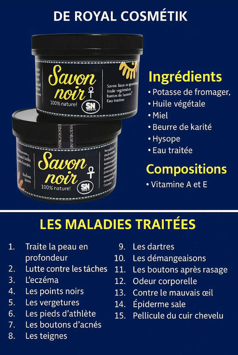 Découvrez le savon noir 100% naturel de Royal Cosmétik, enrichi en vitamine A et E. Idéal pour traiter la peau en profondeur, il lutte efficacement contre l'acné, l'eczéma et les points noirs. Composé de beurre de karité et d'huiles végétales, il adoucit et nourrit l'épiderme. Parfait pour un usage quotidien.