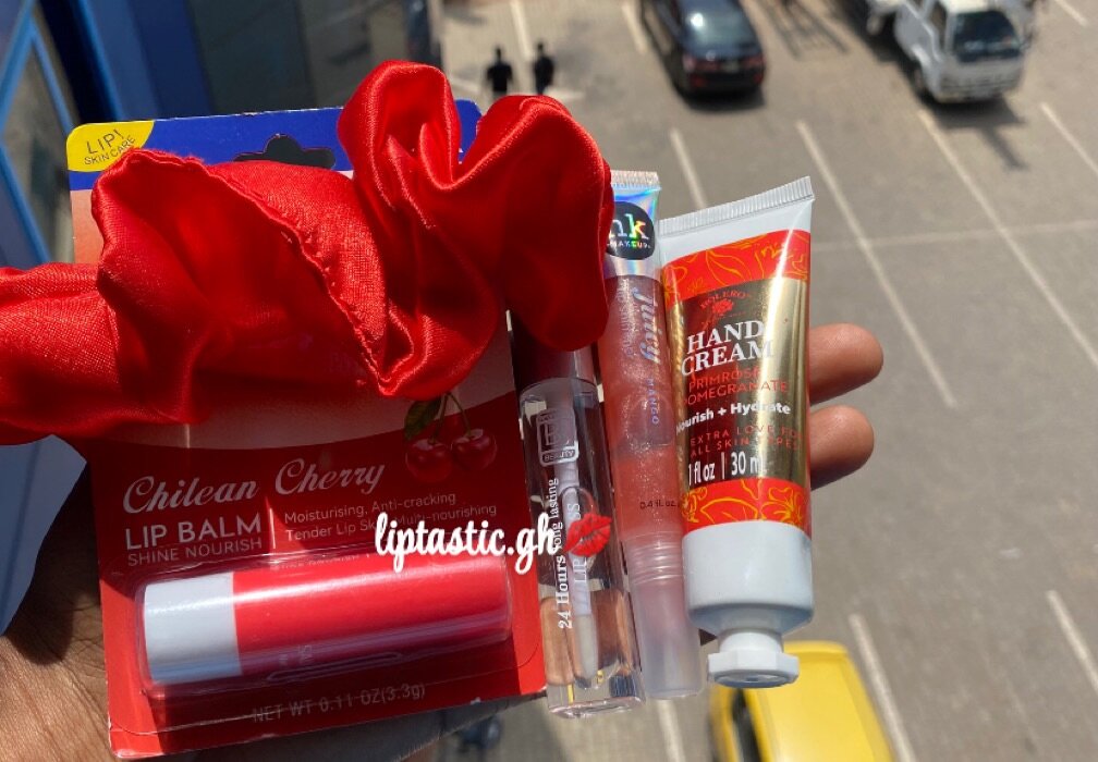Scrunchie,cherry lip balm, BB gloss,Nk gloss Bolero hand lotion