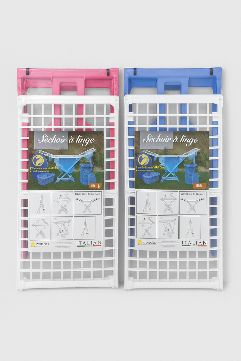 Séchoir à linge pliable, idéal pour espaces restreints. Disponible en rose et bleu. Facile à utiliser et à ranger, parfait pour le quotidien.