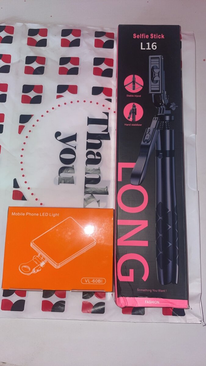 Mobile phone led light and l16 tripod Tripod can be used as a selfie stick and has a hand stabilizer Can be extended a little above 6ft