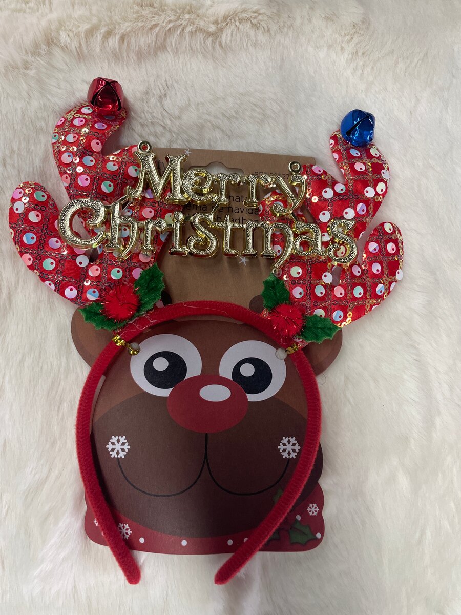 Ajoutez une touche festive à votre tenue avec ce serre-tête renne de Noël. Décoré de paillettes rouges et d'une inscription 'Merry Christmas', il est parfait pour célébrer les fêtes.