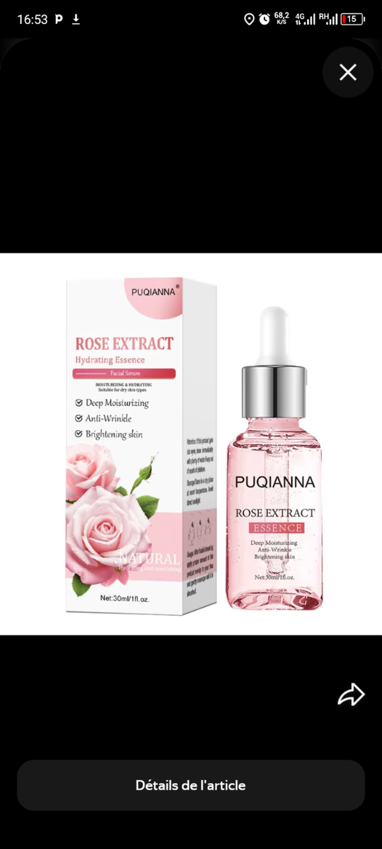 Découvrez notre sérum à l'extrait de rose pour une hydratation intense et une peau lumineuse. Idéal pour réduire les rides et redonner de l'éclat à votre visage. Formulé pour toutes les peaux, ce soin quotidien est parfait pour un teint éclatant et revitalisé. Offrez-vous une expérience de soin luxueuse avec notre essence hydratante Puqianna.