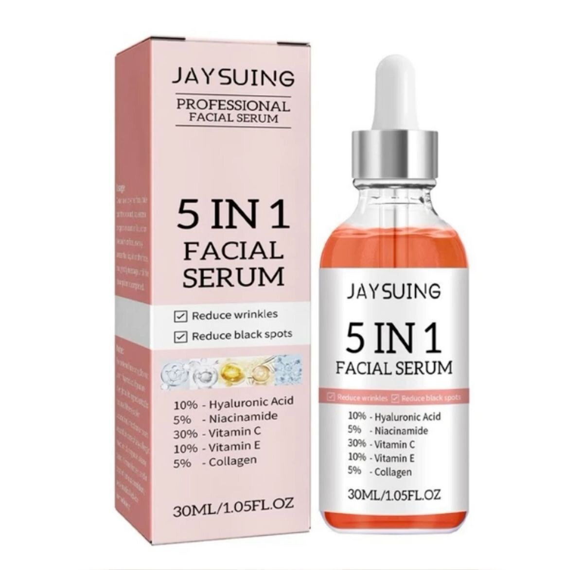 Découvrez le sérum visage 5 en 1 Jaysuing, une solution anti-âge professionnelle. Réduit les rides et les taches, illumine et hydrate la peau grâce à sa formule enrichie en acide hyaluronique, niacinamide, vitamines C et E, et collagène. Idéal pour un teint uniforme et rajeuni.