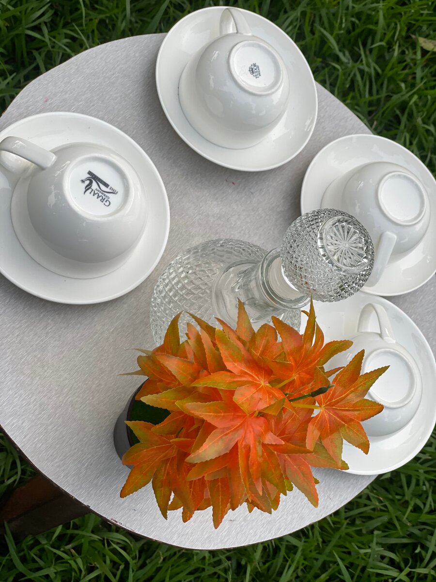 Élégant service à café pour quatre personnes avec tasses en porcelaine blanche et carafe en verre. Parfait pour des moments conviviaux à l'intérieur comme à l'extérieur. Idéal pour les réceptions et les réunions familiales.