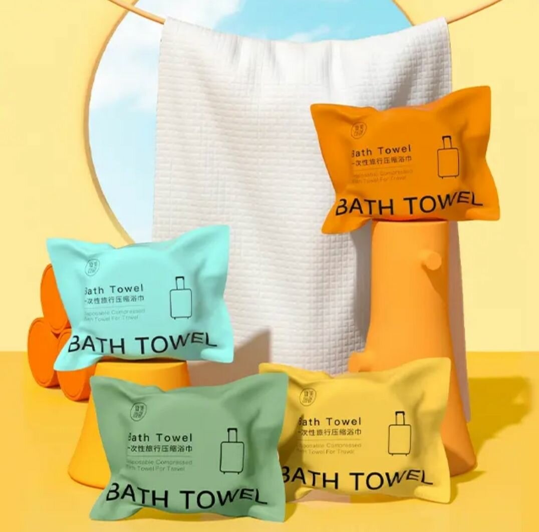 Serviette de bains en coton compressée disponibles, importable partout ou vous voulez et très confortable