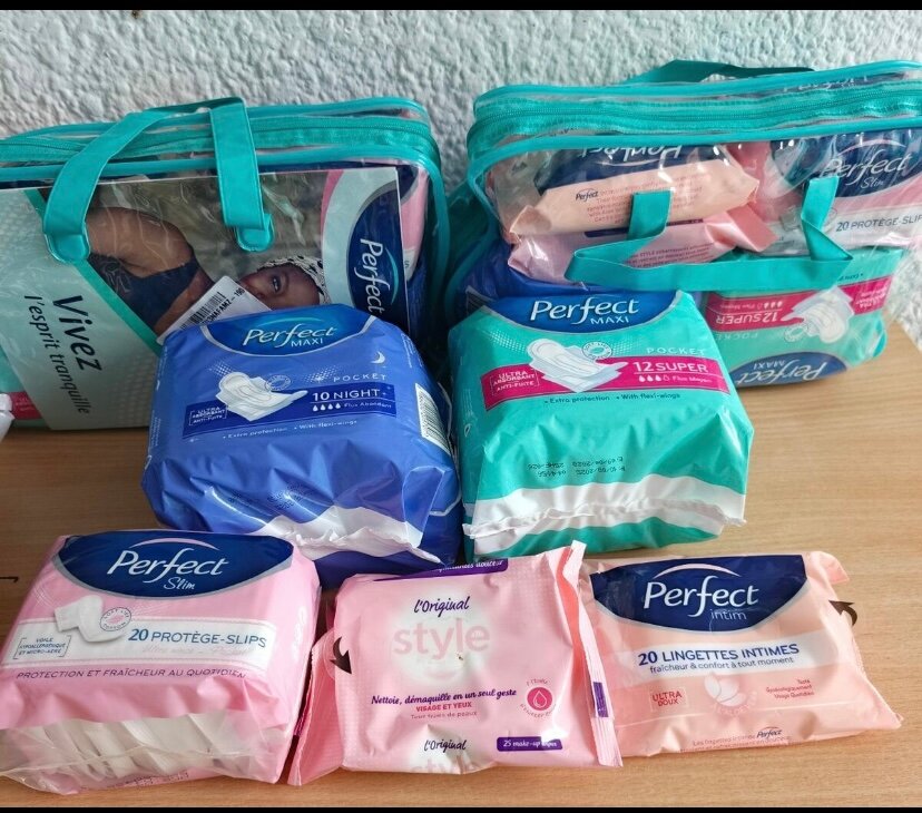 2 paquet de perfect(vania) 1 paquet de lingettes démaquillant 1 paquet de lingette intime 1 paquet de protège -slip 1 trousse pour femme