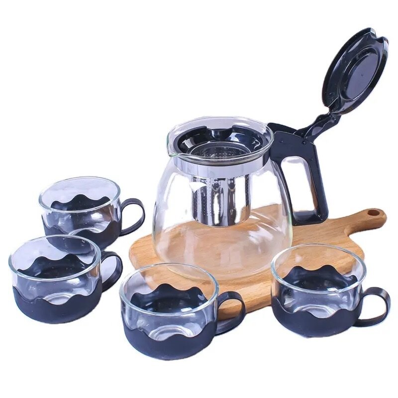 Théière plus 4 tasses en verre recouvert de plastique Dimension du produit: Hauteur: 12 cm Largeur: 15,5 cm Profondeur: 8 cm Nombre de tasses: 4 1 Théière