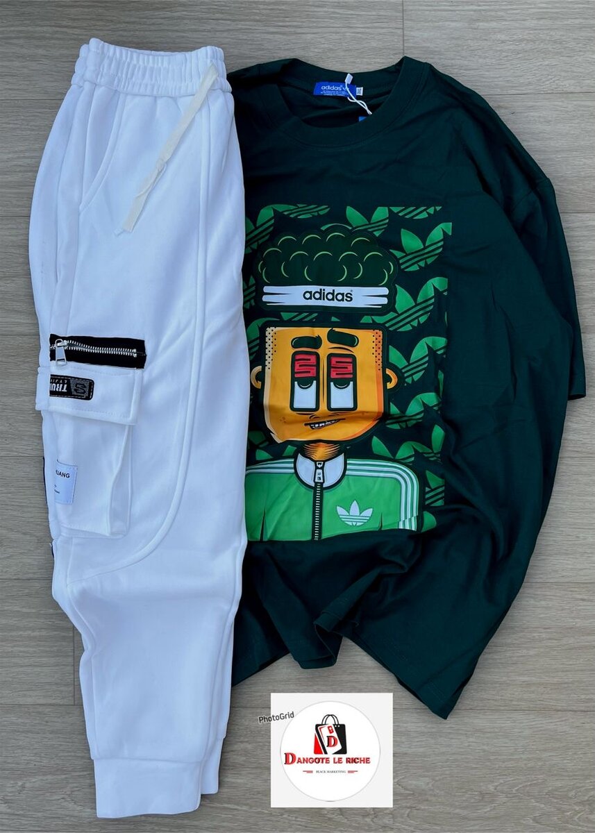 Découvrez le set Adidas tendance avec un t-shirt à imprimé original et un pantalon blanc fonctionnel. Parfait pour un style décontracté et moderne, que ce soit pour le sport ou une sortie en ville. Facilement combinable avec vos sneakers préférées.