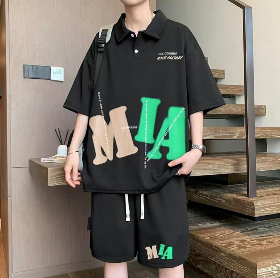 Ensemble décontracté pour homme parfait pour l'été. Composé d'un T-shirt noir à motifs et d'un short assorti. Confortable et stylé, idéal pour les sorties détendues ou les activités sportives.