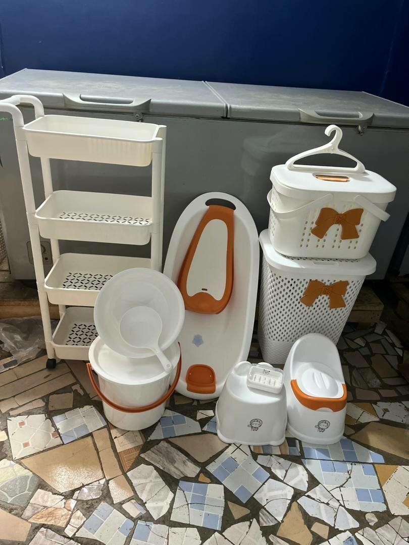 Ce set de bain complet pour bébé offre tout le nécessaire pour le bain et l'organisation. Inclus une baignoire ergonomique, un siège de bain, panier et boîte de rangement. Idéal pour les parents cherchant praticité et style dans la chambre de bébé.