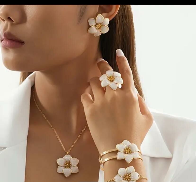 Découvrez l'élégance intemporelle avec ce set de bijoux floraux. Parfait pour ajouter une touche de sophistication à n'importe quelle tenue, ce set comprend des boucles d'oreilles, un collier, une bague et un bracelet, chacun orné de motifs floraux délicats. Fabriqué avec soin pour un confort optimal, il s'agit d'un choix idéal pour les occasions spéciales ou comme cadeau charmant. Complétez votre style avec ce set unique et glamour.