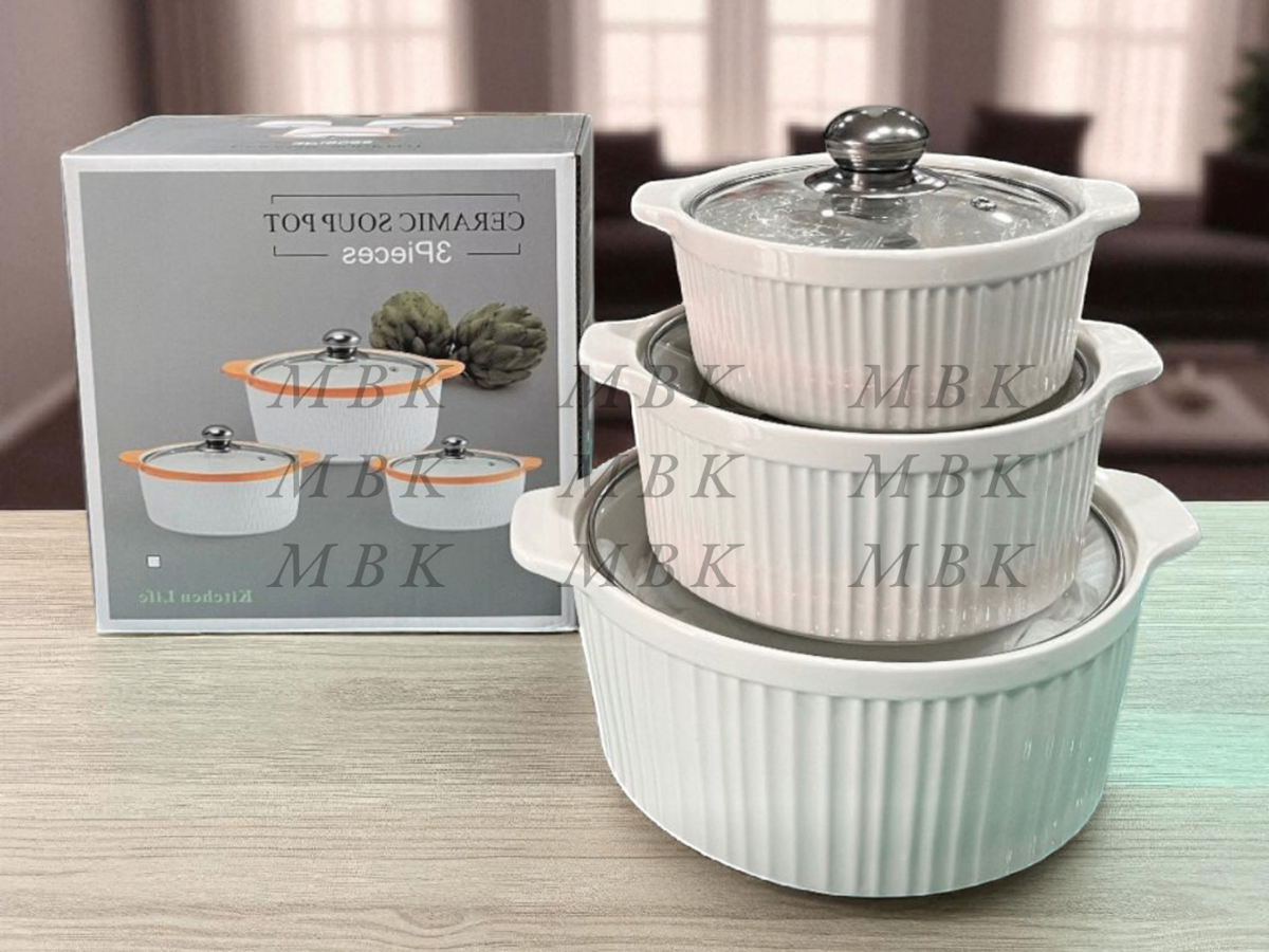 Ensemble de 3 casseroles en céramique idéal pour la préparation de soupes et plats mijotés. Conception élégante avec couvercles assortis, résistant à la chaleur et facile à nettoyer. Parfait pour une cuisine moderne.