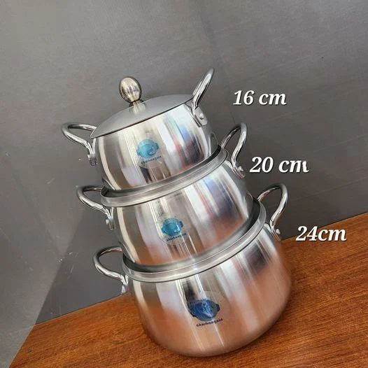 Ensemble de casseroles en acier inoxydable, tailles 16cm, 20cm et 24cm. Idéal pour la cuisine familiale, durable et facile à nettoyer. Parfait pour toutes vos recettes préférées.