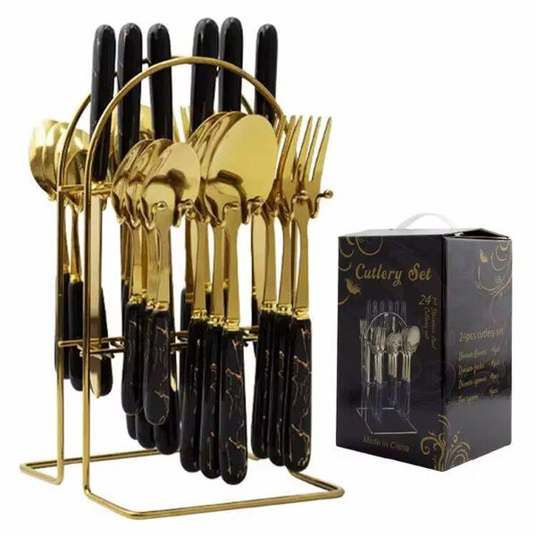 Élégant set de couverts dorés 24 pièces avec support. Idéal pour une cuisine moderne et raffinée. Fabriqué en acier inoxydable, parfait pour les dîners ou cadeaux.