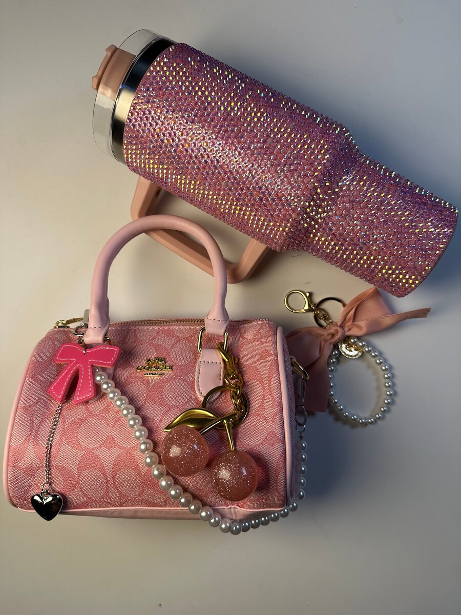Elevate your style with this chic pink handbag, embellished with charming accessories and paired perfectly with a sparkling drink tumbler. Ideal for trendy outings.