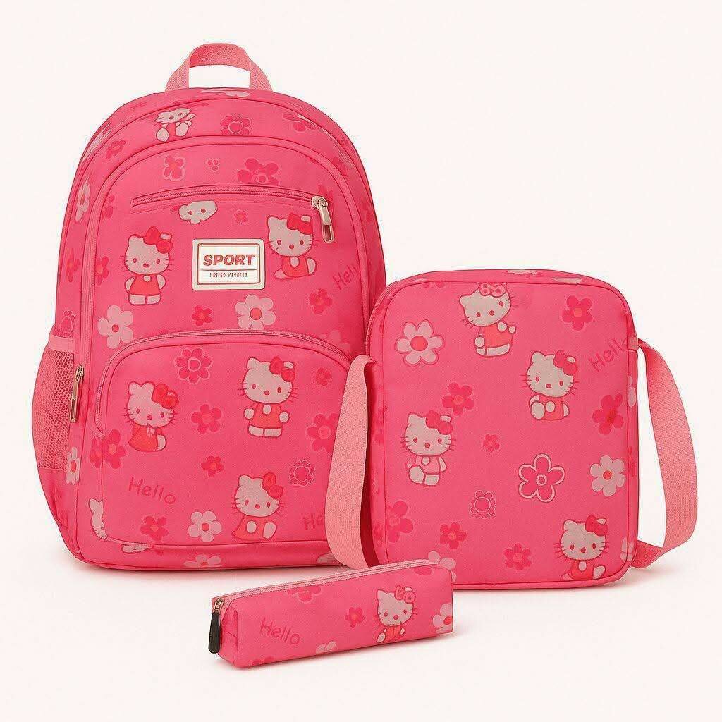 Adorable ensemble de sacs à dos avec un design Hello Kitty. Comprend un grand sac à dos, un sac à lunch et une trousse, parfait pour l'école. Fabriqué avec des matériaux durables pour résister aux activités quotidiennes des enfants. Design attractif et pratique!