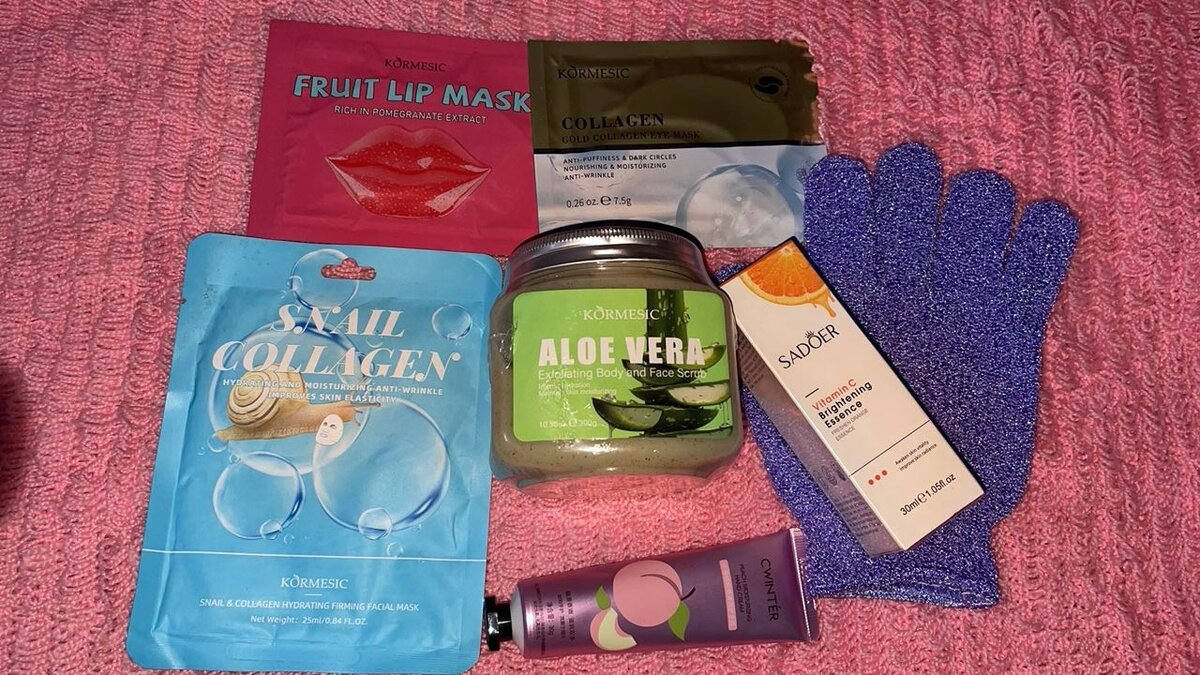 Transformez votre routine avec notre set de soins beauté comprenant - 1 masques pour le visage -1 gommage à l'aloe vera - 1 gants exfoliants -1 serum vitamine C - 1 crème main - 1 masque anti cernes - 1 masque lèvres
