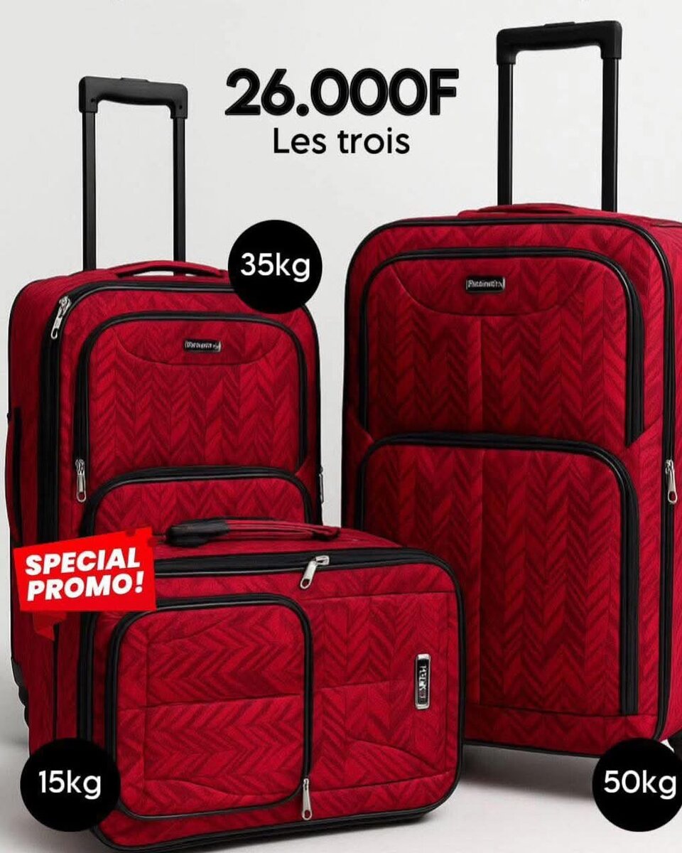 Ensemble de valises rouges robustes, idéal pour tous vos voyages. 3 tailles : 15kg, 35kg, 50kg. Offrez-vous style et praticité avec des roues pivotantes et une poignée télescopique. Parfait pour des vacances réussies !