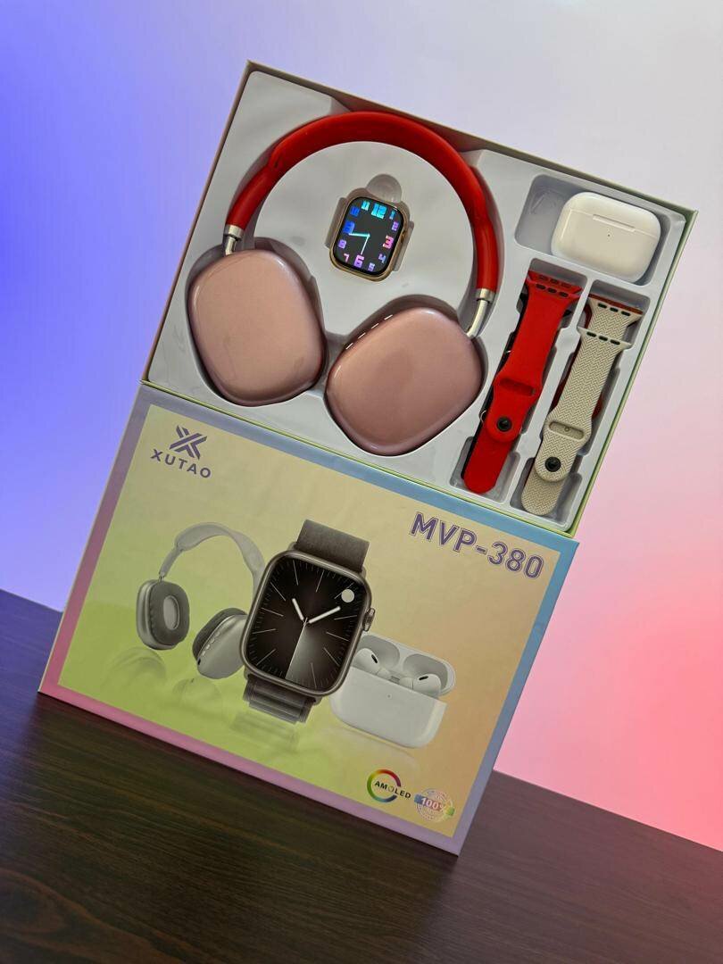 Découvrez le set MVP-380, composé d'écouteurs élégants, de montre connectée et de bracelets interchangeables. Parfait pour les amateurs de technologie et de style.