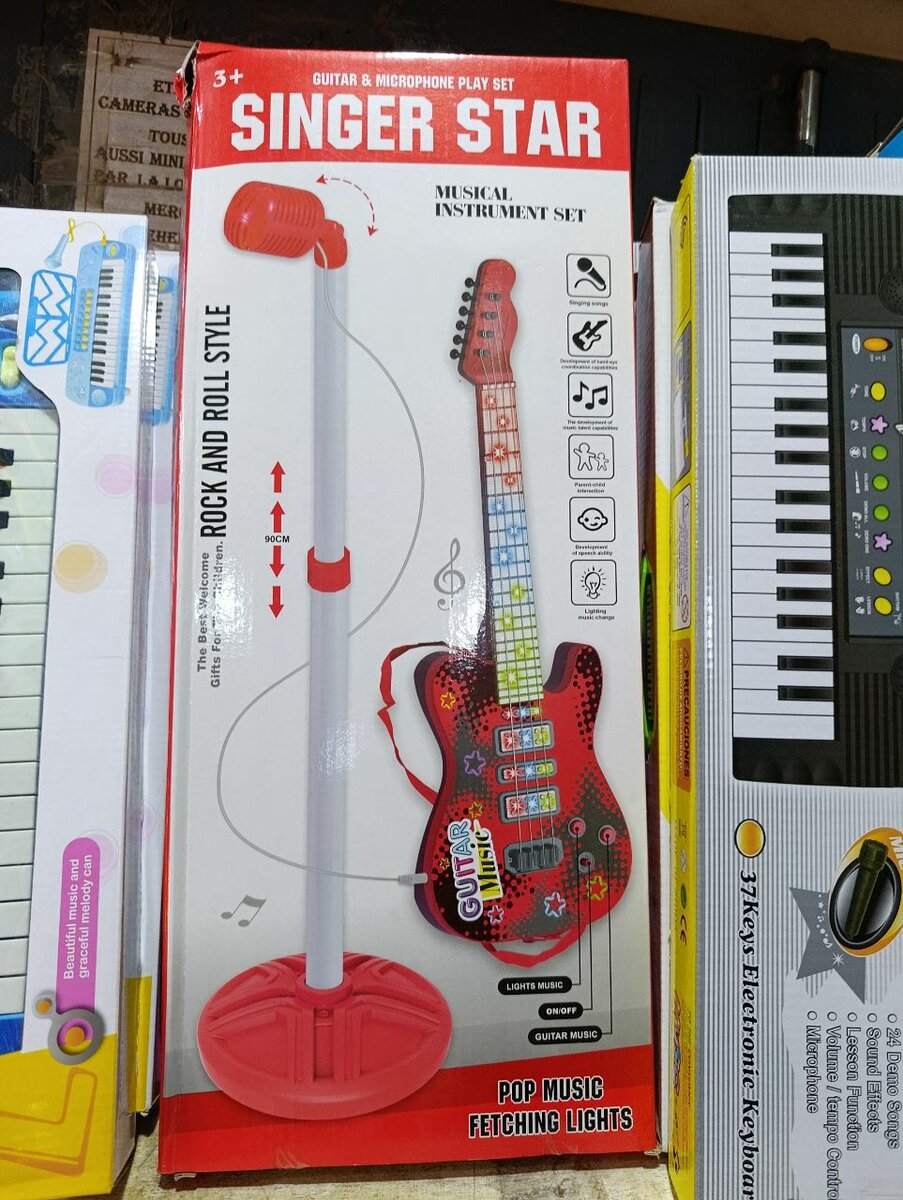 Kit micro et guitare pour enfants. Parfait pour éveiller l'artiste en herbe. Lumières et sons stimulants pour des heures de jeu. Idéal pour les jeunes musiciens.