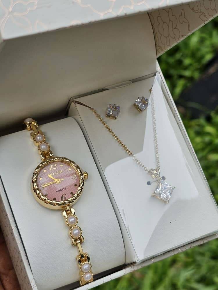 Élégant set de montre dorée avec pierres scintillantes, accompagné d'un collier et boucles d'oreilles assortis. Idéal pour une touche de glamour au quotidien ou pour une occasion spéciale. Offrez-vous ce luxe accessible pour parfaire votre style!
