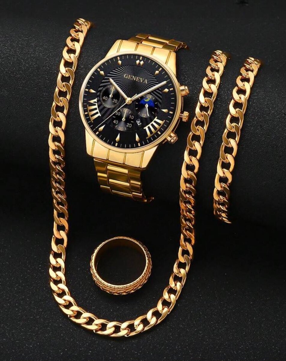 Découvrez notre élégant set pour hommes comprenant une montre raffinée, un bracelet, une bague et un collier. Parfait pour apporter une touche de sophistication à n'importe quelle tenue professionnelle ou décontractée. Fabriqué à partir de matériaux durables, ce set est un cadeau idéal pour les occasions spéciales. Exprimez votre style unique avec cet ensemble intemporel!