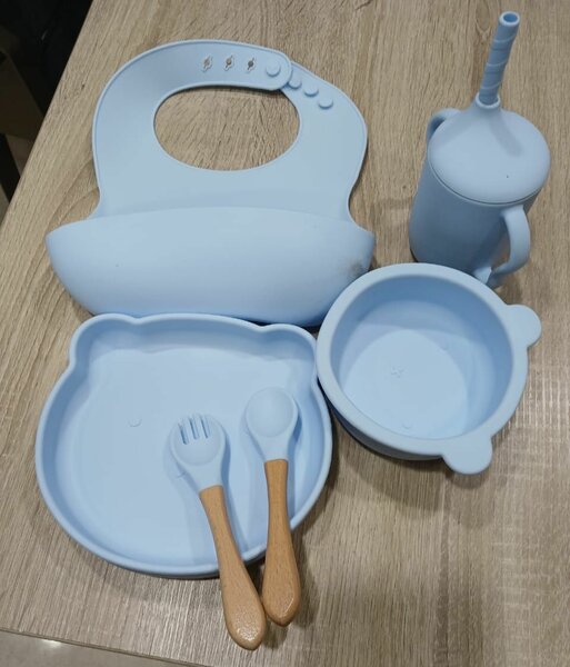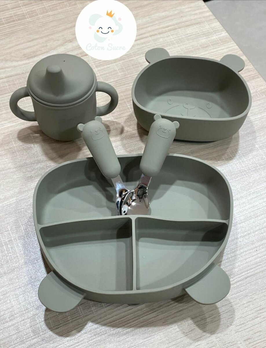 Ensemble de repas en silicone pour bébé, comprenant un plateau à compartiments, un bol, une tasse et des couverts. Sécuritaire et facile à nettoyer, idéal pour les repas quotidiens des tout-petits.