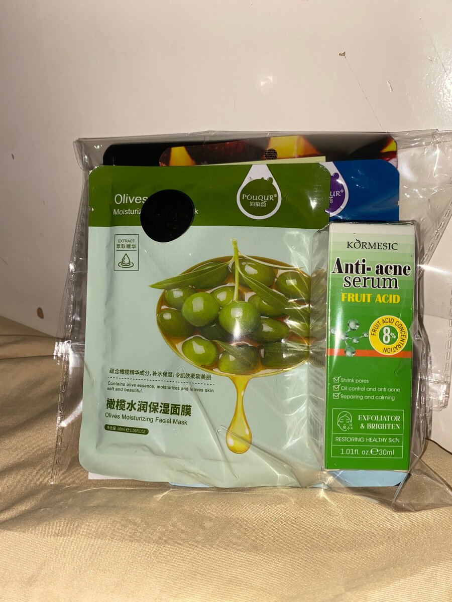 Ensemble idéal pour lutter contre l'acné et hydrater la peau avec un sérum anti-acné aux acides de fruits et un masque facial hydratant à l'huile d'olive. Parfait pour un soin complet et une peau éclatante.
