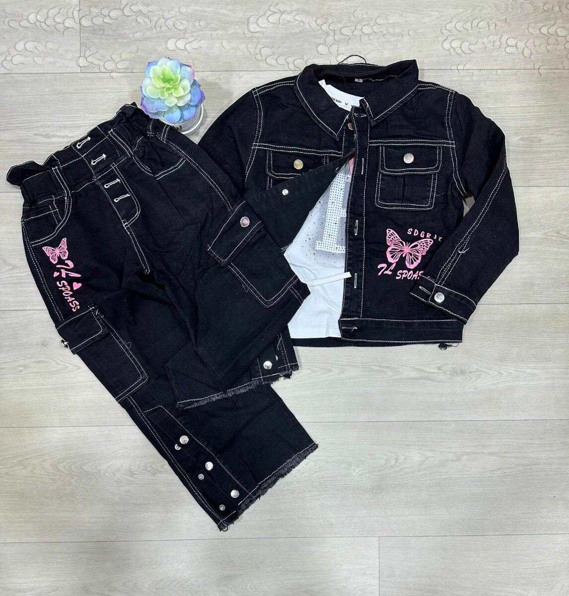 Ensemble stylé pour enfants avec veste et pantalon en denim. Confortable et tendance, idéal pour une tenue quotidienne élégante. Décoré de motifs papillon colorés, ce set ajoute une touche fun à la garde-robe. Parfait pour toutes les occasions!