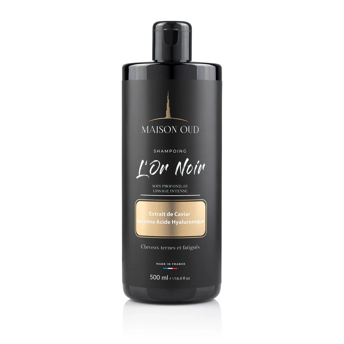 Découvrez le shampooing L'Or Noir de Maison Oud, enrichi en extrait de caviar, kératine et acide hyaluronique. Parfait pour revitaliser les cheveux ternes et fatigués. Offrez à vos cheveux un soin digne d'un salon, directement à la maison.