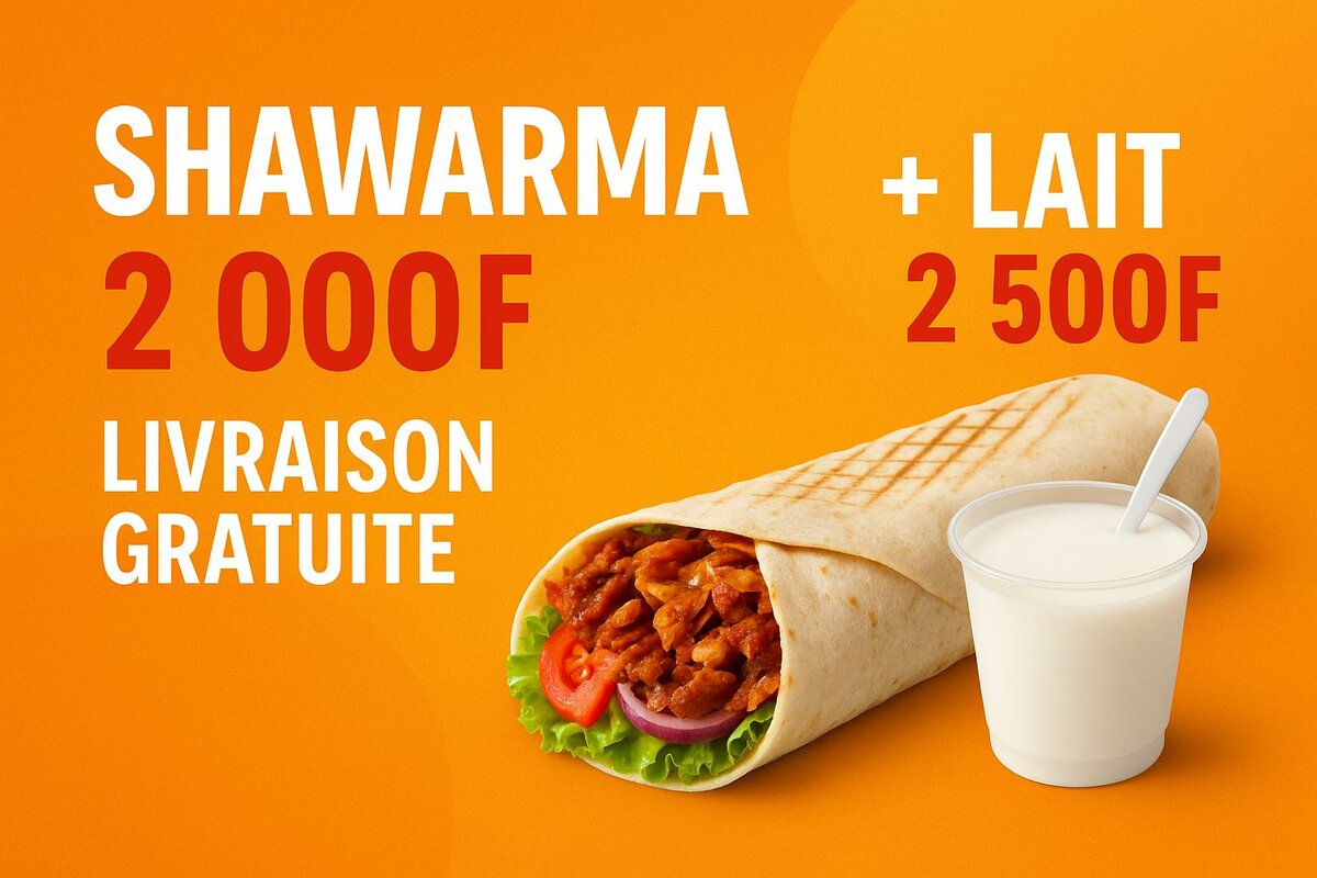 Savourez notre shawarma juteux accompagné d'un lait frais. Parfait pour un déjeuner rapide et savoureux. Livraison gratuite pour que vous puissiez profiter de ce plaisir gourmand à votre porte sans frais supplémentaires. Essayez-le aujourd'hui!