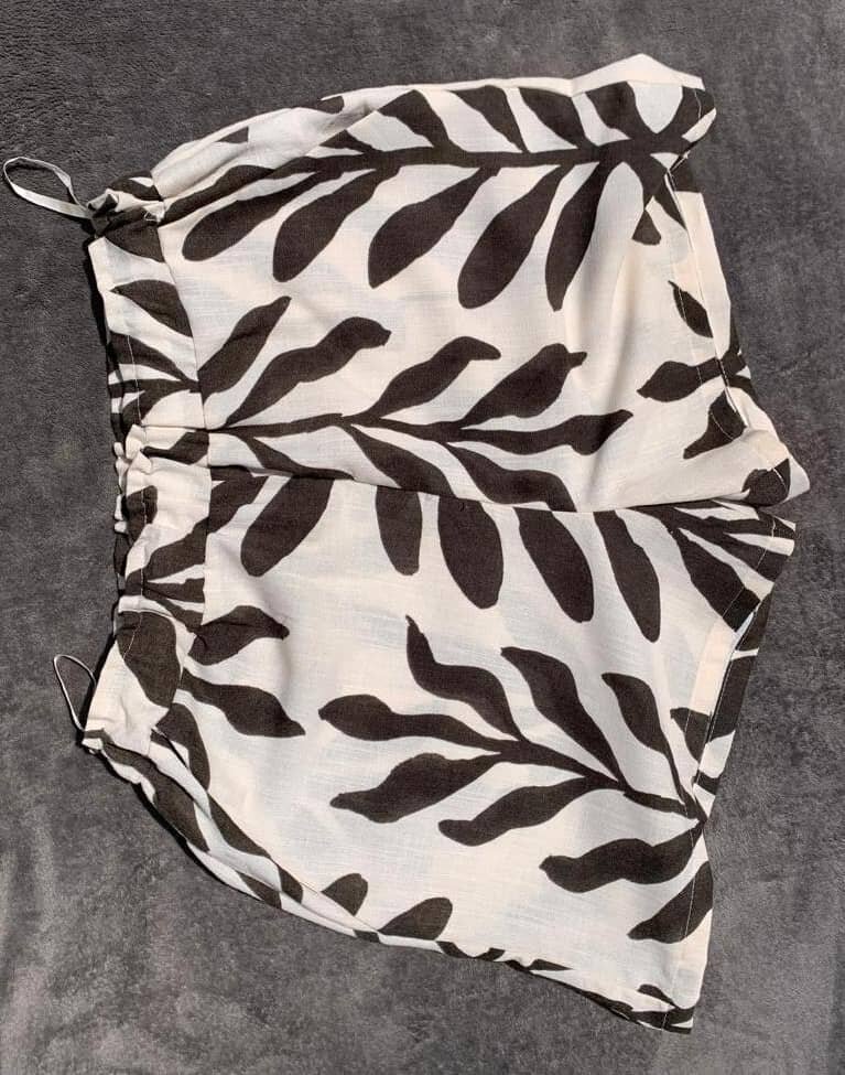 Short en tissu léger et confortable, idéal pour les journées ensoleillées. Taille ajustable avec cordon. Motif fleuris marron sur fond beige, style estival.