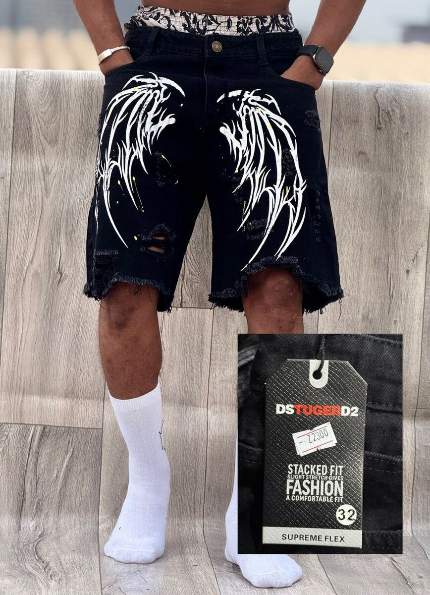 Découvrez notre short en jean noir avec un imprimé unique d'ailes blanches, parfait pour un look audacieux cet été. Fabriqué en tissu stretch pour un confort optimal, ce short offre une coupe élégante et moderne. Idéal pour les sorties décontractées ou les festivals, il apportera une touche de style à votre garde-robe.