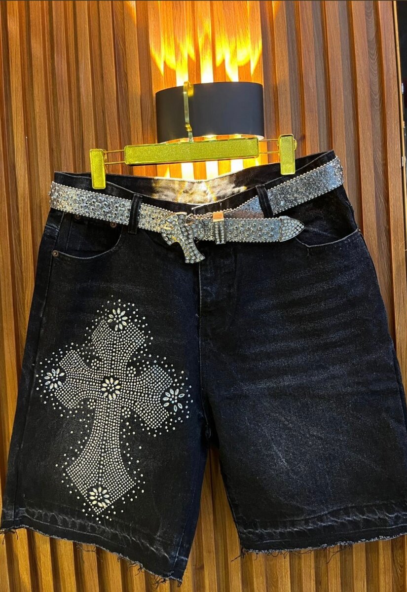 Exprimez votre style unique avec ce short en jean noir orné d'une croix scintillante. Idéal pour des looks audacieux et tendance, ce vêtement est parfait pour les sorties urbaines ou décontractées. Sa coupe confortable et son design unique en font un ajout essentiel à votre garde-robe d'été.