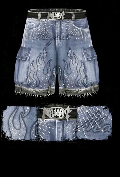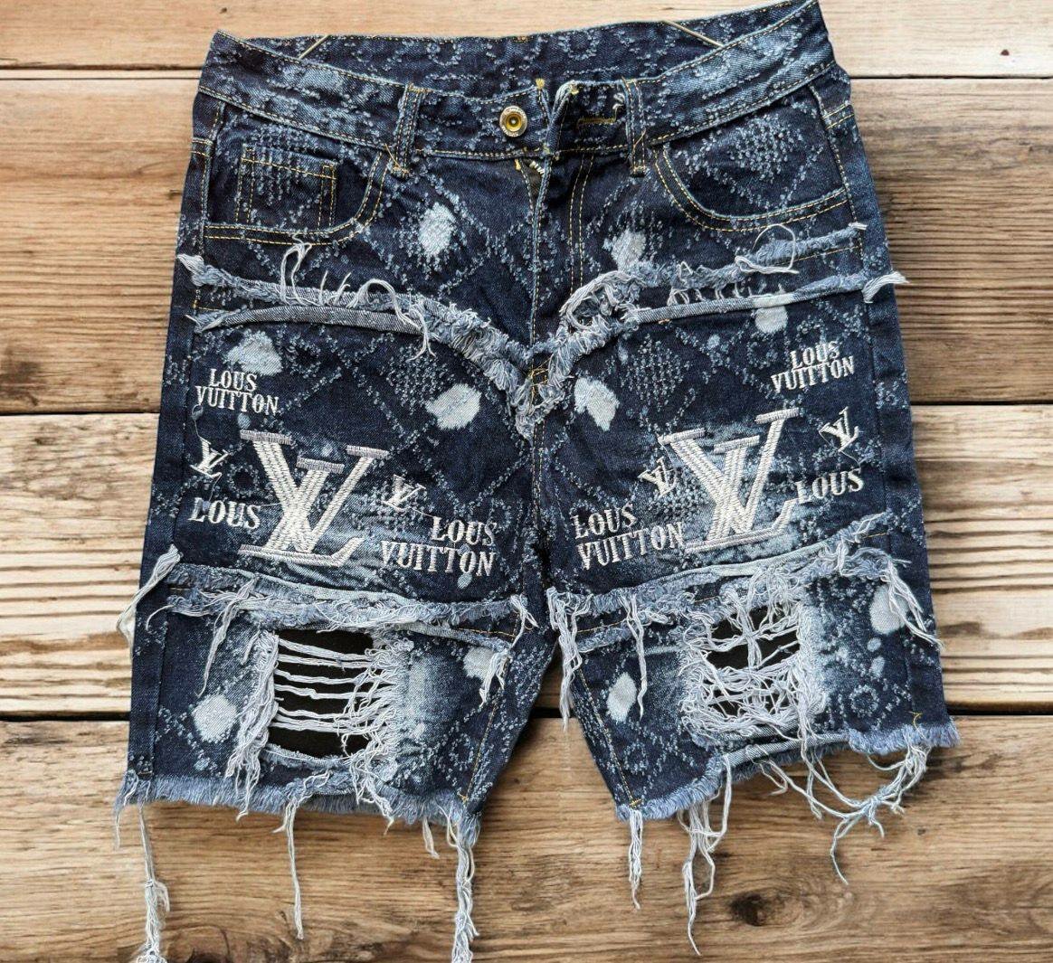 Découvrez ces shorts en jean déchiré avec un imprimé Louis Vuitton, parfaits pour un look streetwear audacieux. Résistants et confortables.