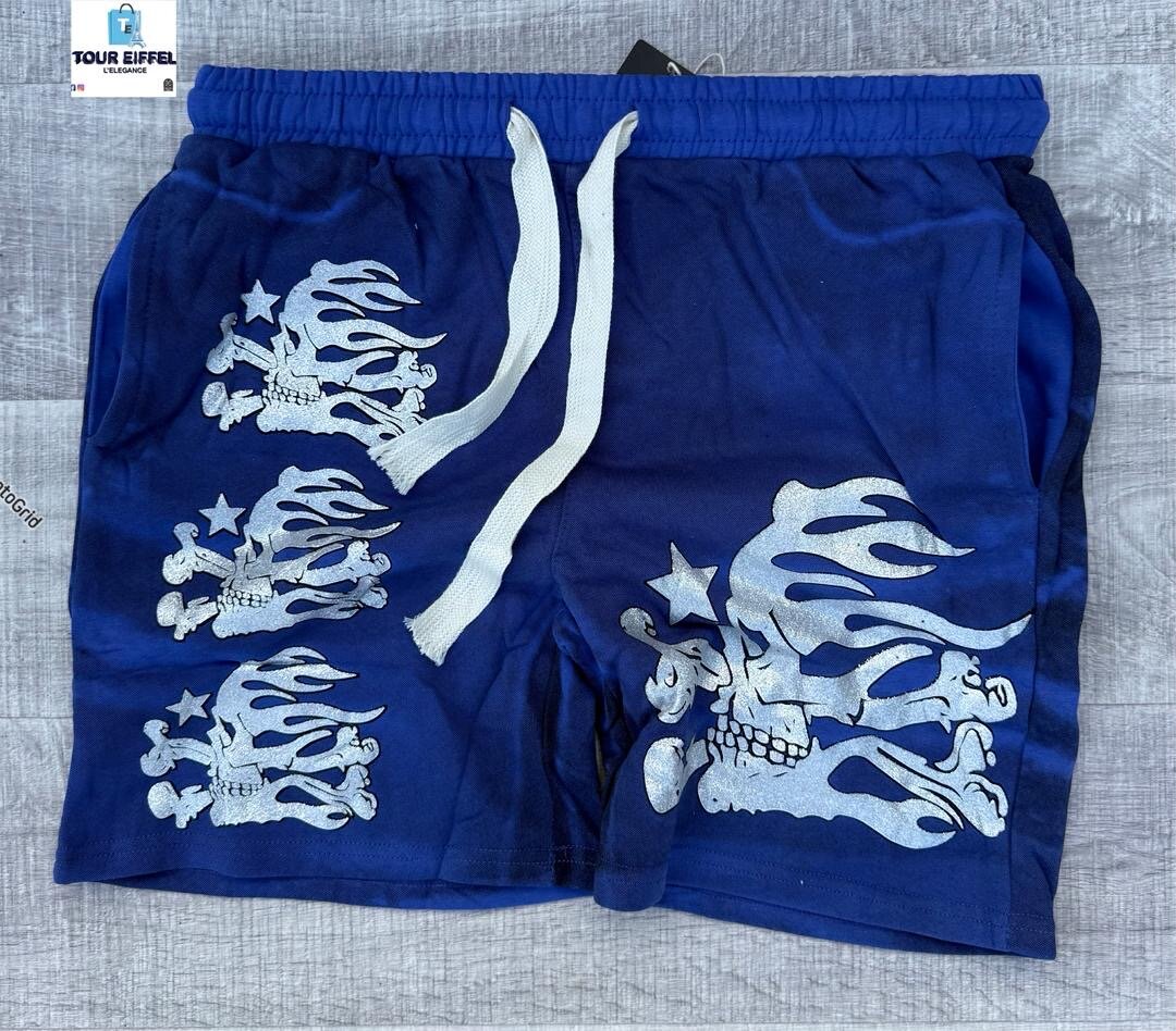 Shorts bleus avec un design audacieux d'imprimé crâne. Idéals pour un style décontracté ou sportif. Fabriqués pour le confort avec une ceinture élastique et un cordon de serrage. Parfait pour les loisirs ou les journées relaxantes.