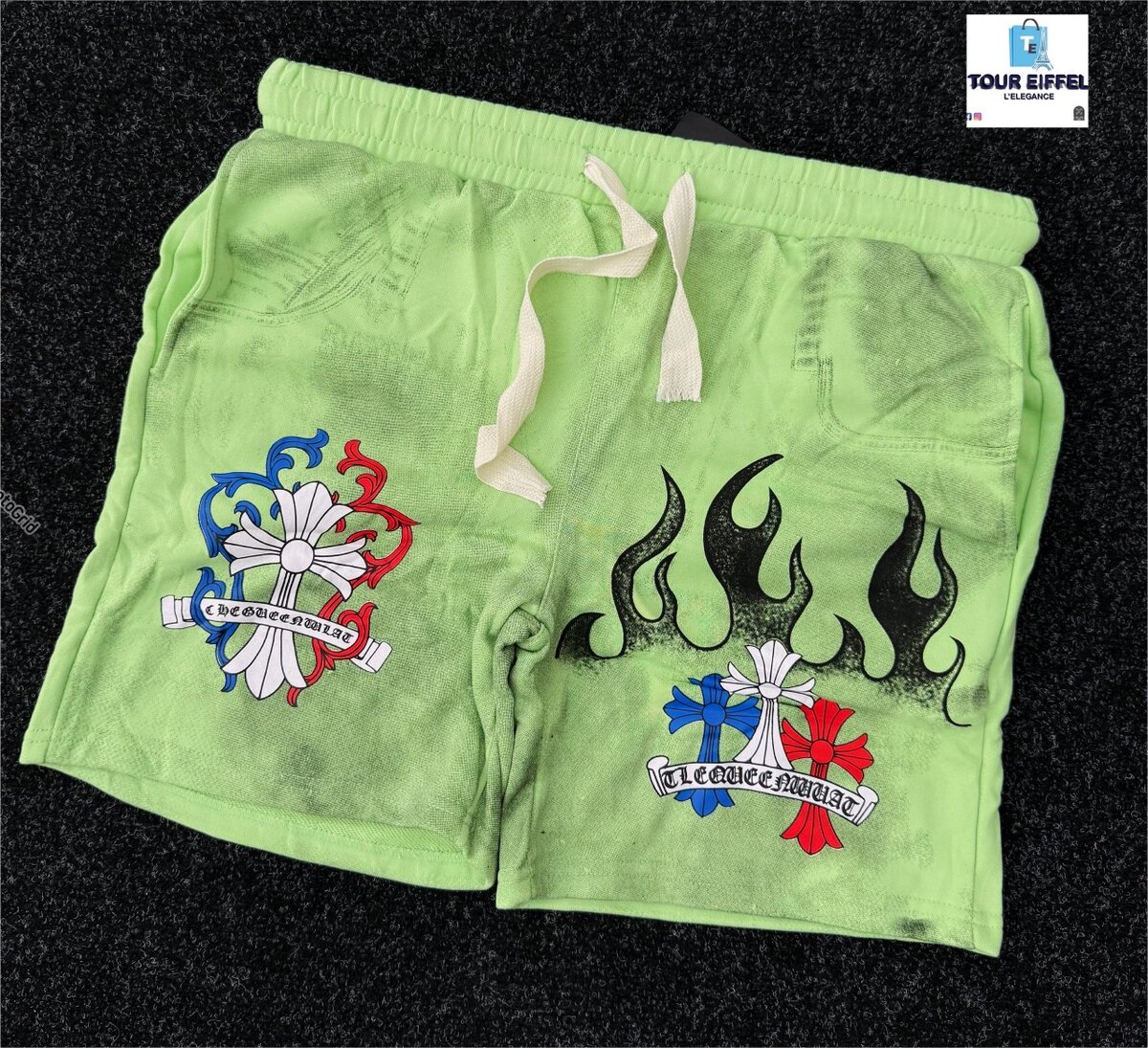 Découvrez nos shorts verts au design unique avec des motifs modernes. Parfaits pour un style décontracté et confortable en toute occasion. Idéal pour les amateurs de mode urbaine.