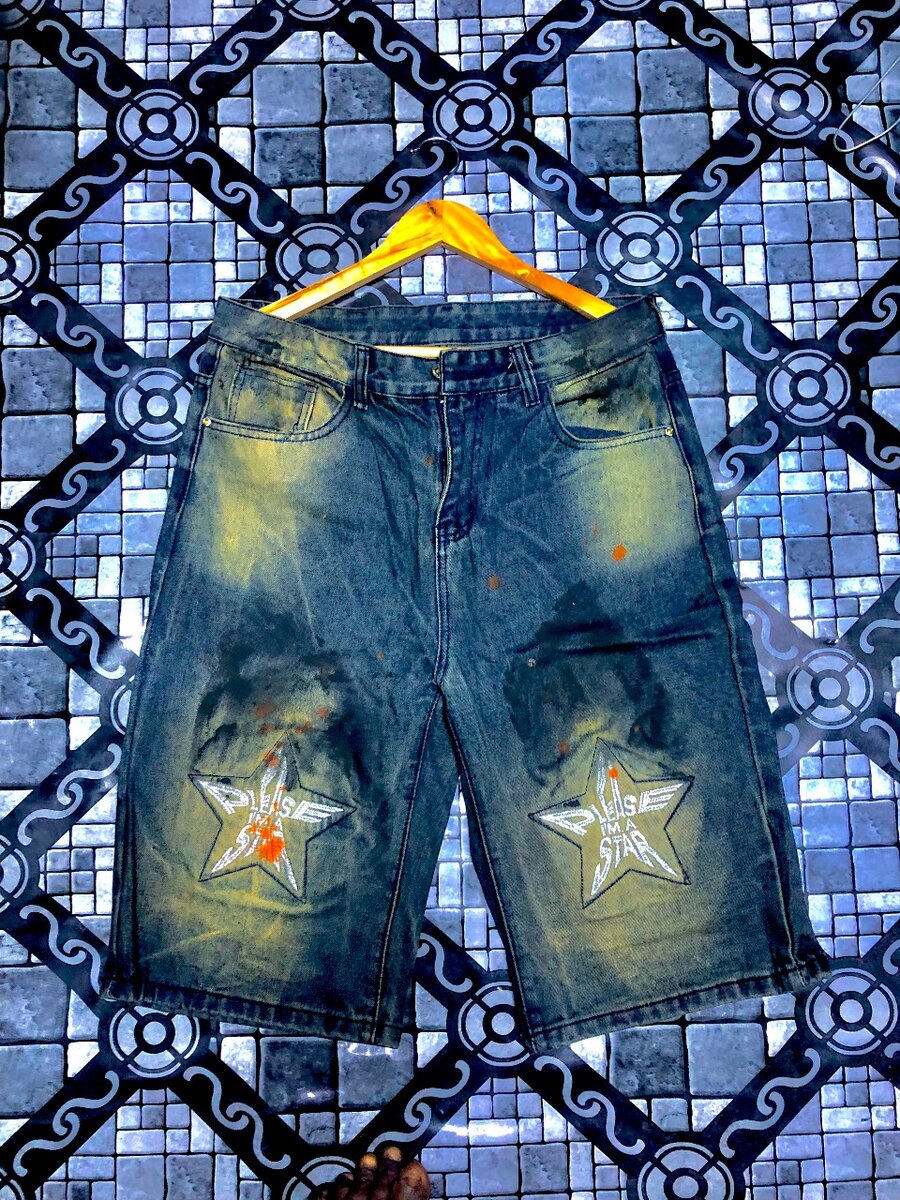 Découvrez ces shorts en denim pour homme avec un design unique d'étoile. Parfaits pour un style décontracté et tendance, ils offrent à la fois confort et originalité. Idéals pour les sorties estivales ou une journée à la plage.