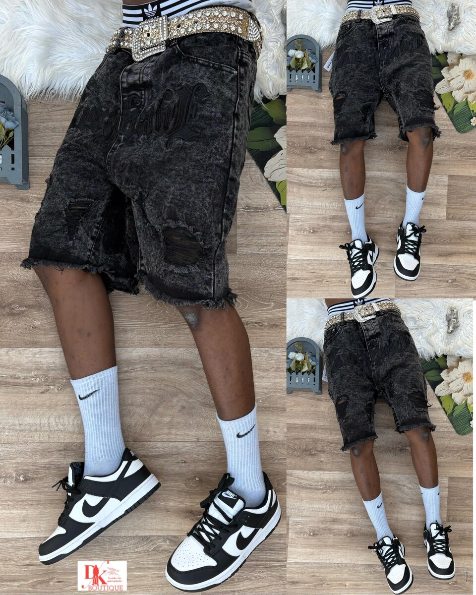Découvrez ces shorts en denim noir délavé pour un look urbain et tendance. Idéal pour les sorties décontractées, leur style usé apporte une touche de caractère.