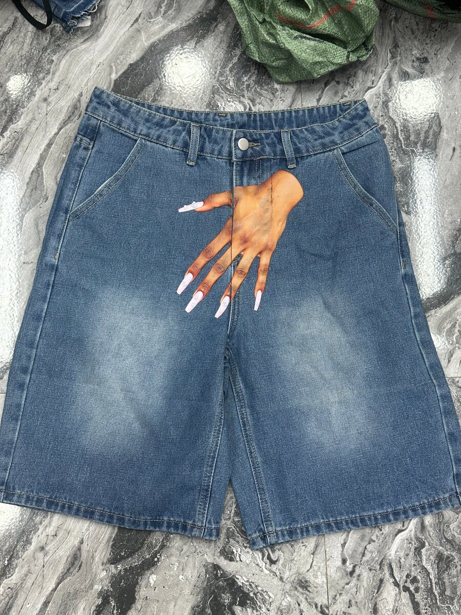 Découvrez ces shorts en jean tendance avec un motif audacieux de main. Confortables et stylés, ils sont parfaits pour un look décontracté. Idéal pour les sorties estivales ou les balades en ville. Fabriqués en denim de qualité, ils offrent un ajustement parfait et un style unique qui ne passera pas inaperçu.