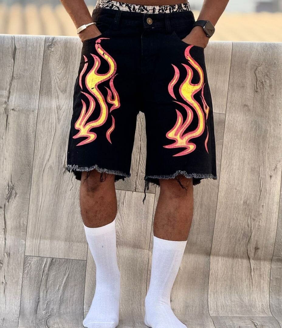 Optez pour ces shorts en jean audacieux avec des motifs flamboyants et artistiques. Parfaits pour une tenue décontractée et tendance, ils ajoutent une touche de style unique à votre garde-robe. Confortable et résistant, idéal pour l'été.