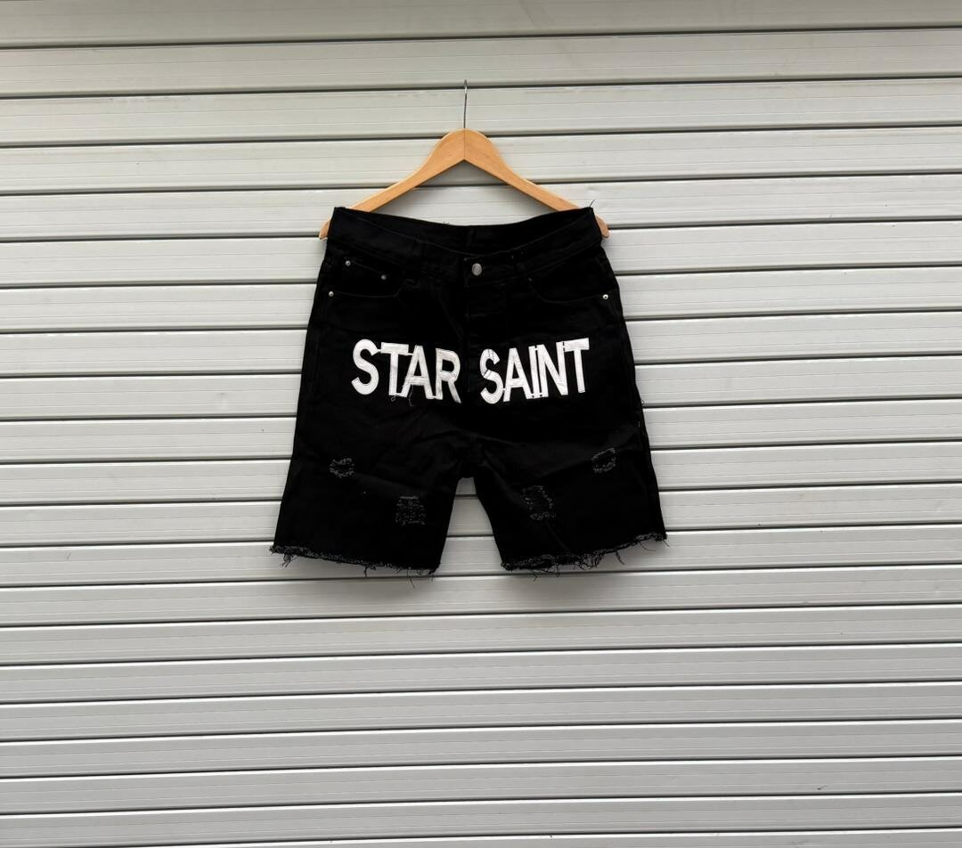 Découvrez ces shorts en jean noirs avec un style déchiré et l'inscription unique 'Star Saint'. Idéal pour un look décontracté et tendance cet été. Fabriqués avec soin pour un confort optimal et une durabilité maximale. Parfaits pour les sorties décontractées ou les festivals.