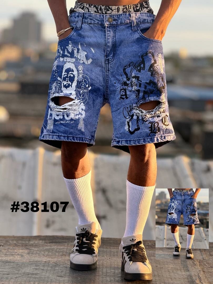 Découvrez ces shorts en jean uniques avec des imprimés audacieux et des détails déchirés. Parfait pour un look urbain et stylé. Confortables et idéal pour les journées décontractées. Un incontournable pour la garde-robe masculine moderne !
