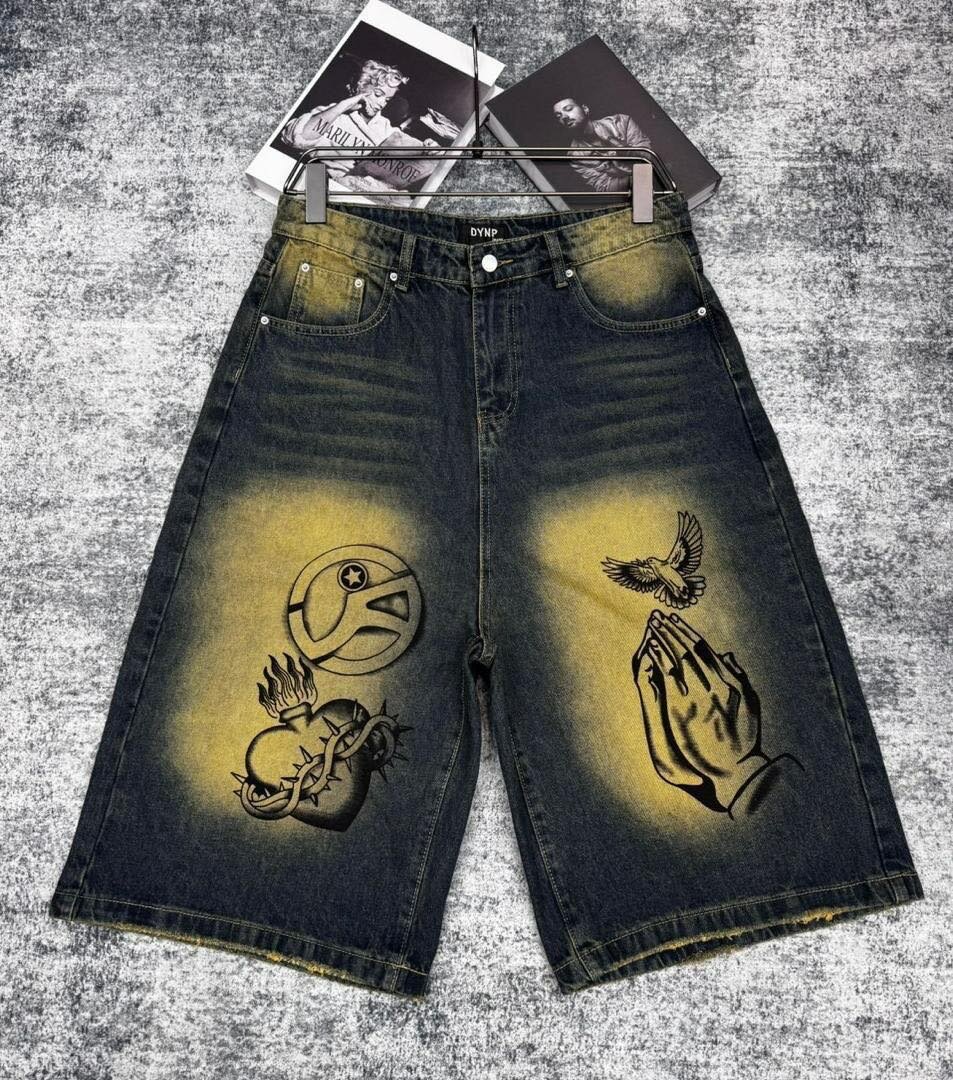 Optez pour ces shorts en jean noir tendance avec imprimés artistiques uniques. Parfaits pour un look décontracté et audacieux. Confortables et stylés, idéals pour les sorties urbaines ou les occasions relax.