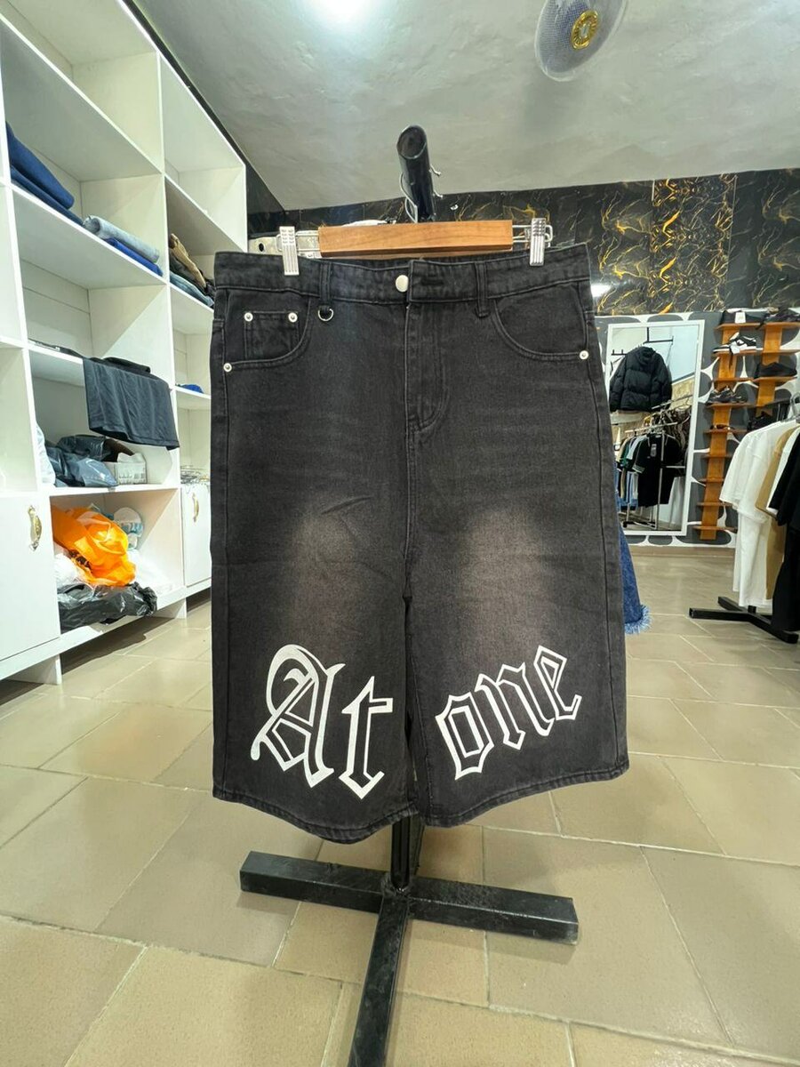 Découvrez ces shorts en jean noir tendance avec un lettrage audacieux 'At one'. Parfaits pour un look décontracté ou urbain, ces shorts offrent confort et style pour toutes vos sorties.