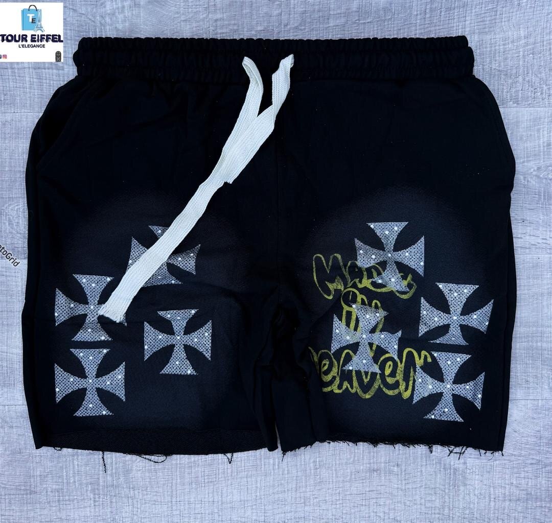 Découvrez notre short tendance "Made in Heaven", parfait pour un look décontracté et stylé. Son design unique avec des croix et son inscription originale ajoutent une touche moderne à votre tenue. Conçu pour le confort avec une taille élastique et un cordon de serrage, idéal pour tous les jours ou pour vos séances de sport. Accentuez votre style dès aujourd'hui avec ce must-have de la saison!