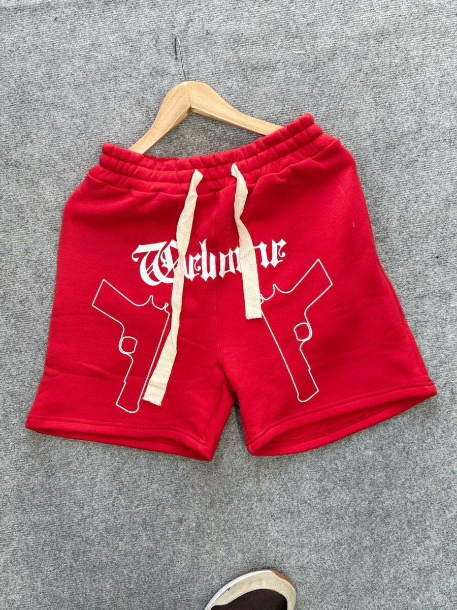 Optez pour un look audacieux avec ces shorts rouges ornés d'un motif pistolet. Confortables et stylés, ils sont parfaits pour un style urbain décontracté. Idéal pour l'été ou les séances de sport.